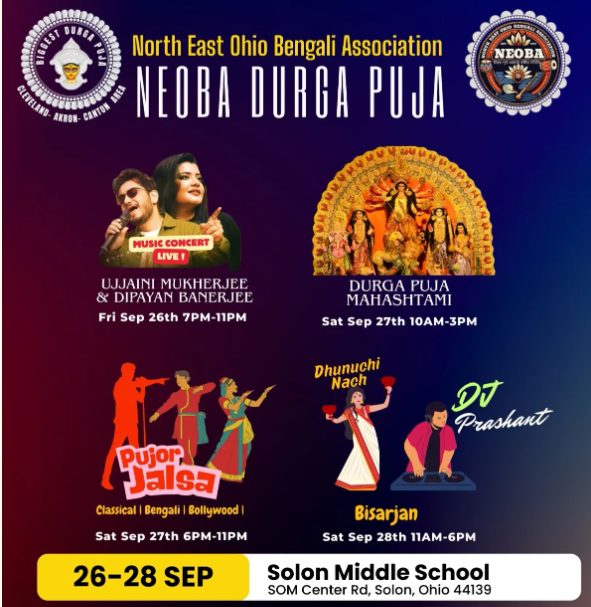 North East Ohio Bengali Association AKA NEOBA is organizing Durga puja in the middle school of Solon. We are offering some discount packages on puja. Our exciting flash sales for Durga Puja 2025 are just around the corner – keep watching this space for unbeatable offers!