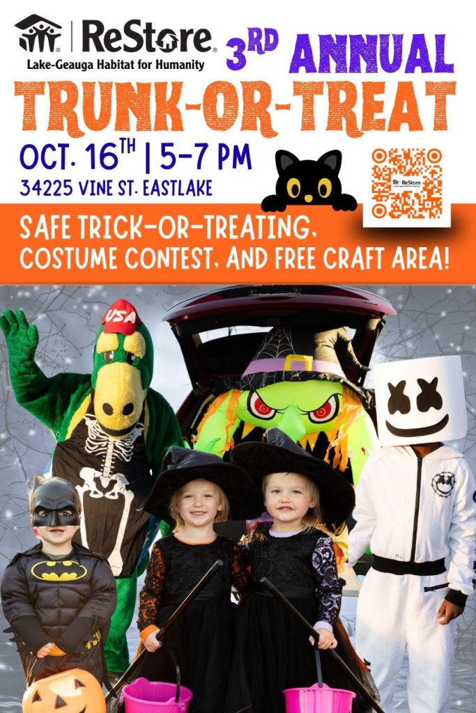 Enjoy decorated trunks, free candy, a kids’ craft area and a costume contest on Thursday, October 16 from 5-7 p.m. at Lake-Geauga Habitat for Humanity ReStore.